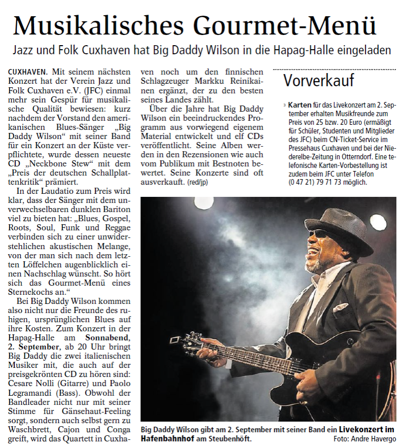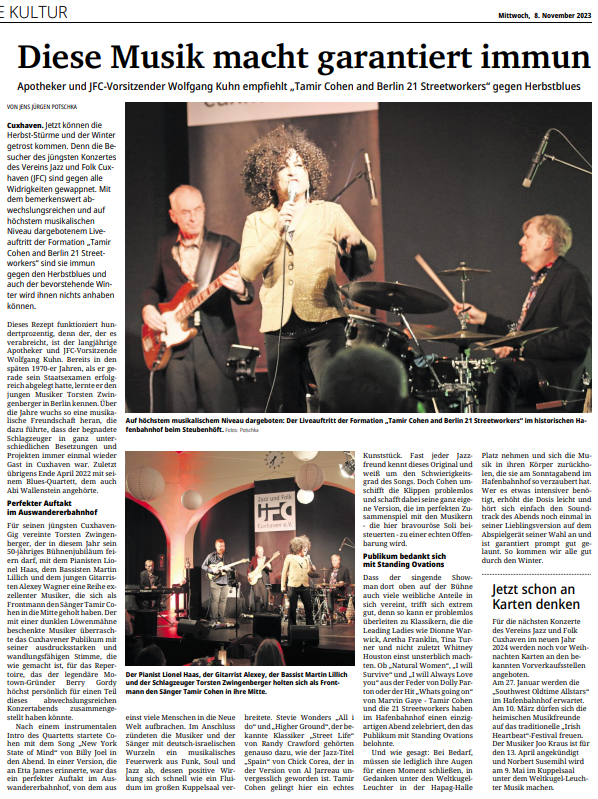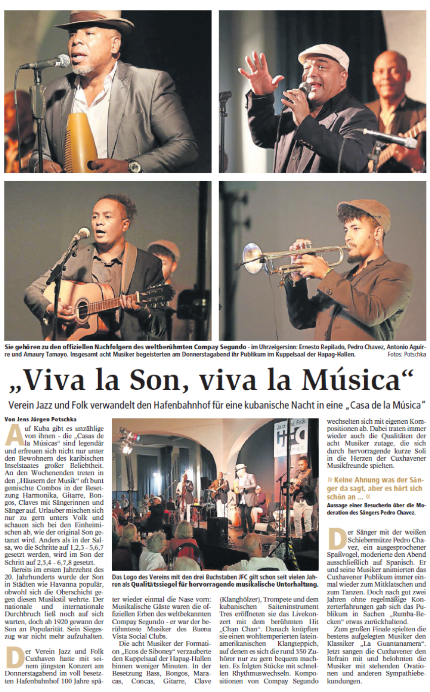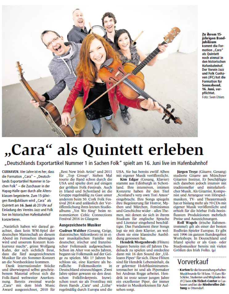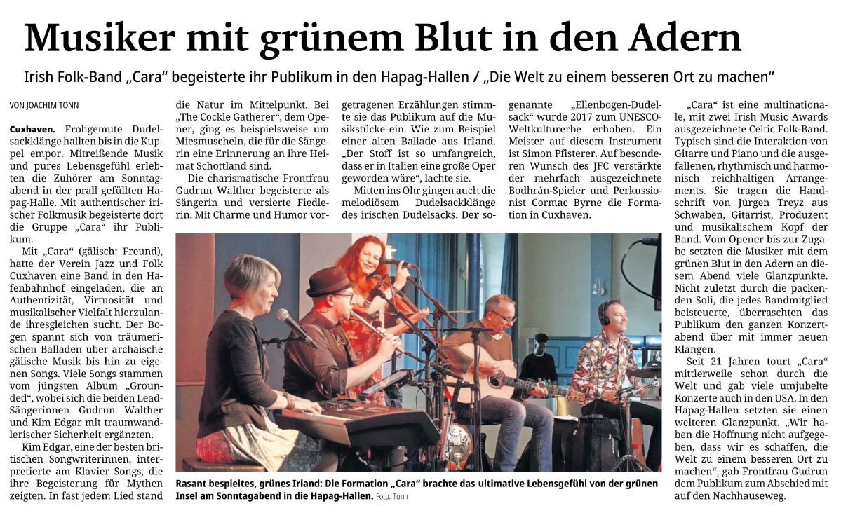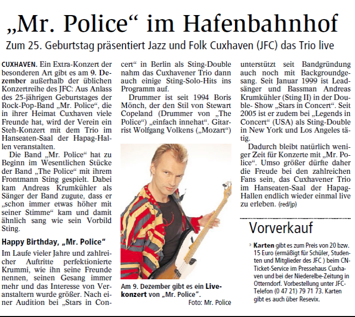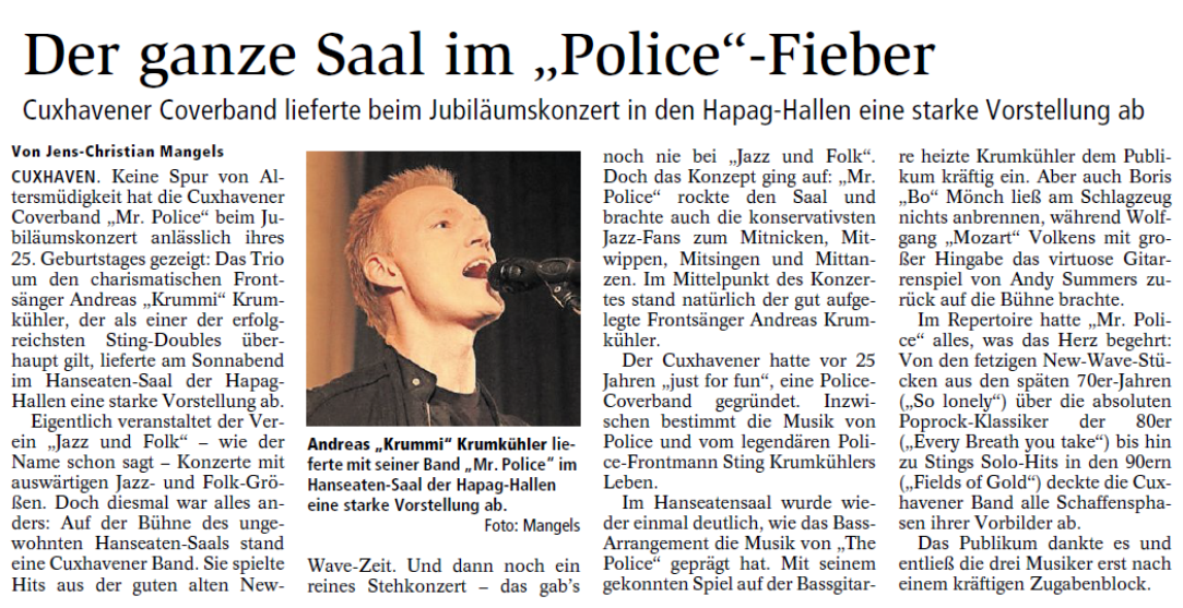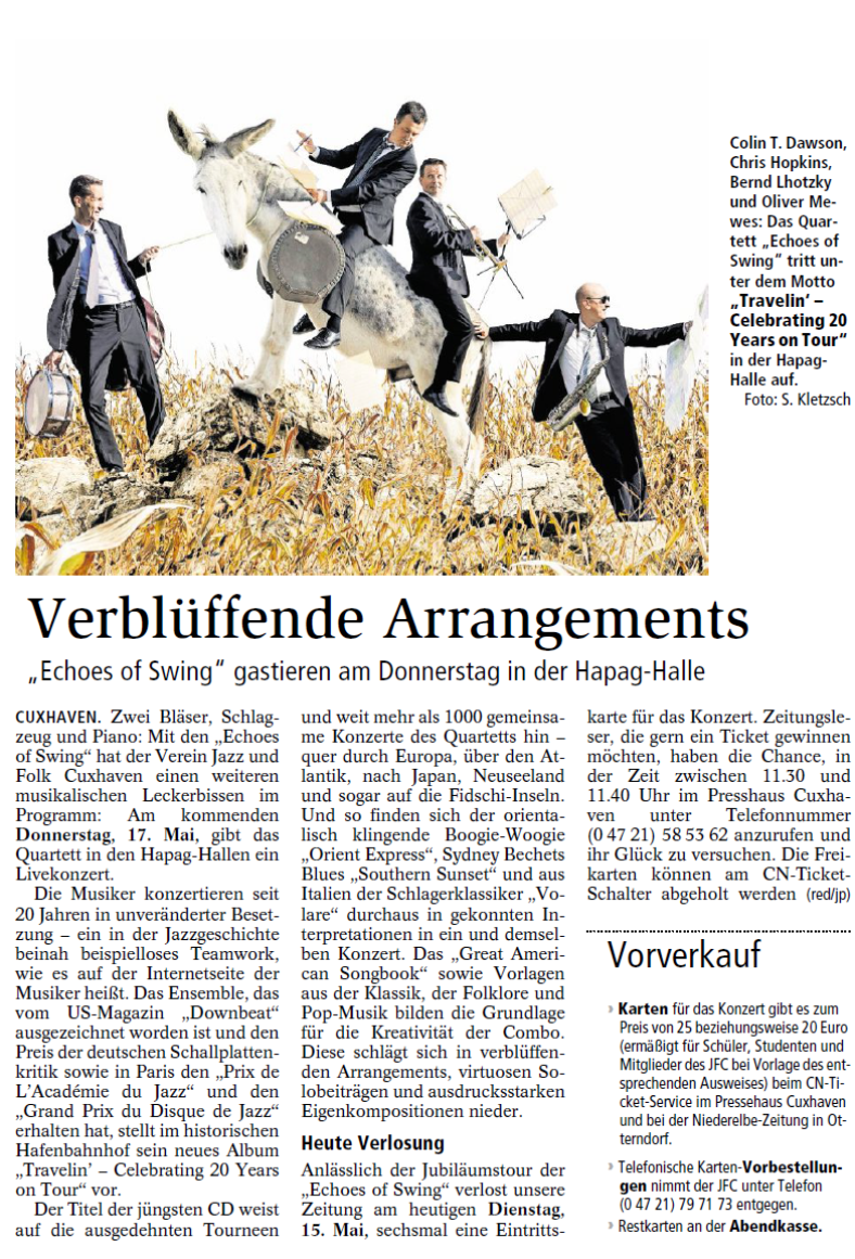 Mit freundlicher Genehmigung der Cuxhaven-Niederelbe Verlagsgesellschaft mbH & Co. KG., vertreten durch Herrn Güler, dürfen wir die nachfolgenden Presseartikel veröffentlichen. Wir bedanken uns für die langjährige Unterstützung! Eintrittskarten für unsere Konzerte erhalten Sie beim Ticket-Service der Cuxhavener Nachrichten (Kaemmererplatz 2, 27472 Cuxhaven). Quellenangabe und Backlink: www.cn-online.de. Alle Rechte auf Fotos und Texte verbleiben beim Urheber bzw. bei dem jeweiligen Rechteinhaber.
