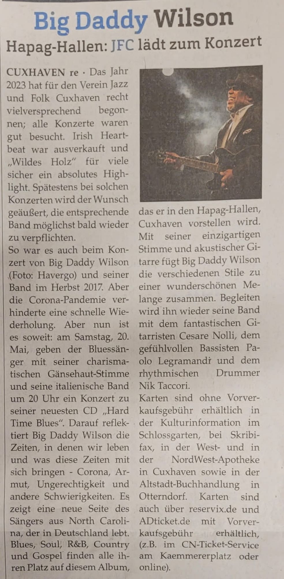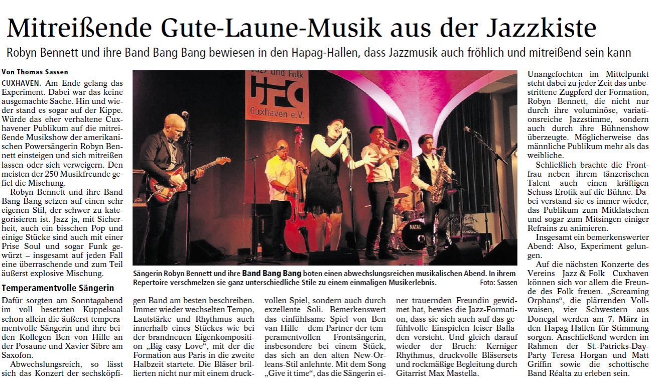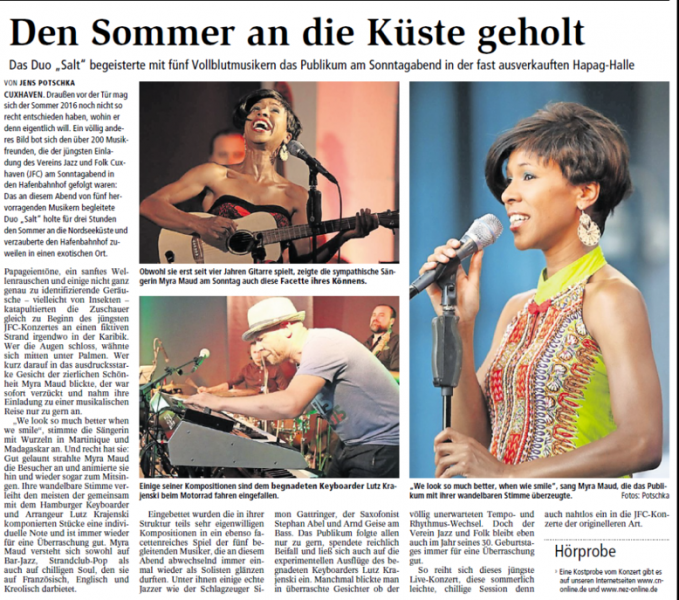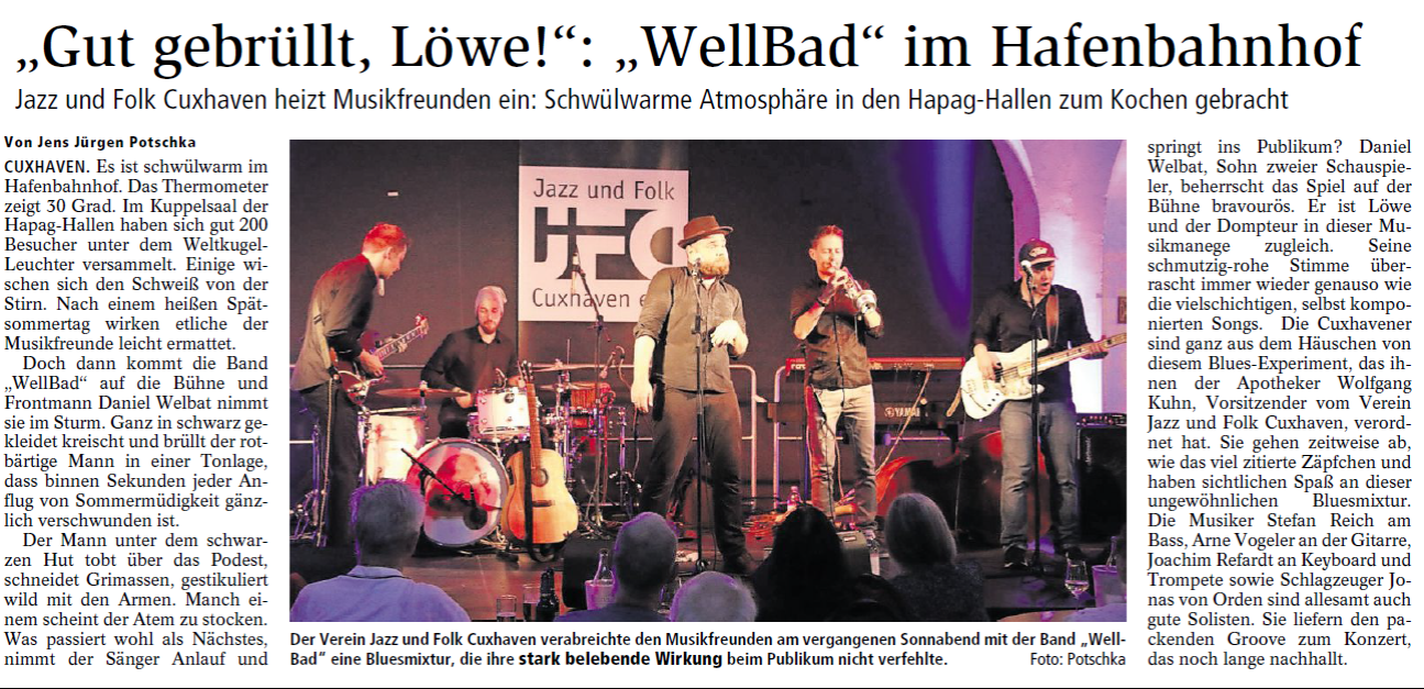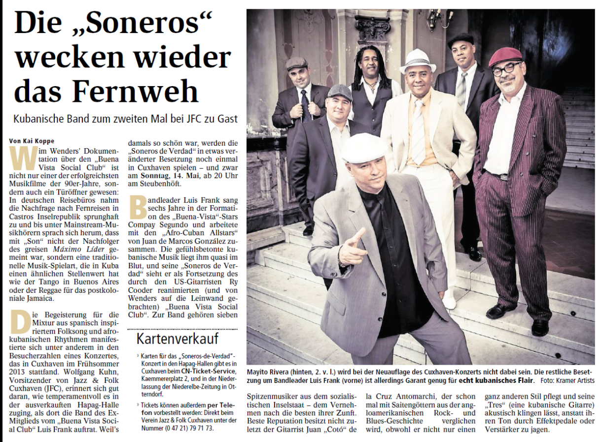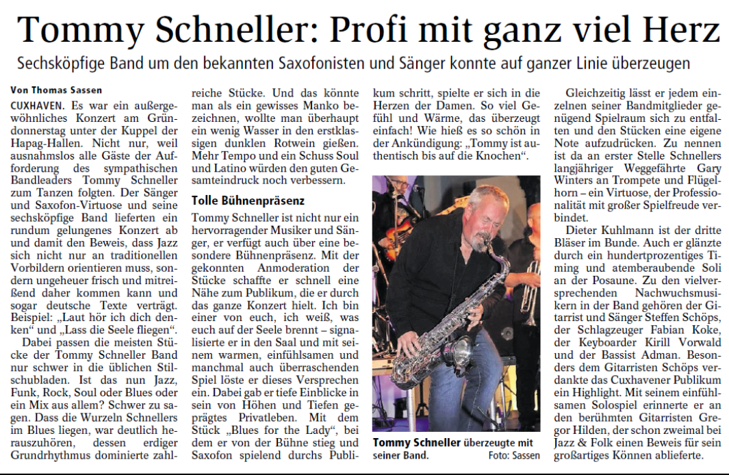 Mit freundlicher Genehmigung der Cuxhaven-Niederelbe Verlagsgesellschaft mbH & Co. KG., vertreten durch Herrn Güler, dürfen wir die nachfolgenden Presseartikel veröffentlichen. Wir bedanken uns für die langjährige Unterstützung! Eintrittskarten für unsere Konzerte erhalten Sie beim Ticket-Service der Cuxhavener Nachrichten (Kaemmererplatz 2, 27472 Cuxhaven). Quellenangabe und Backlink: www.cn-online.de. Alle Rechte auf Fotos und Texte verbleiben beim Urheber bzw. bei dem jeweiligen Rechteinhaber.